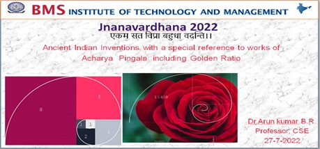 Dr. Arunkumar B.R delivered a session on “Ancient Indian inventions with a special reference to works of Acharya Pingala including Golden Ration” on 27.7.2022 as a part of Jnanavardhana series 2022 which is a unique programme of BMSIT&M.