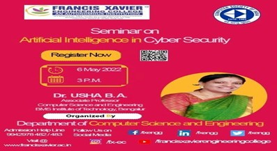 Dr. Usha B A, Associate Professor, Dept of CSE has delivered the talk on Artificial Intelligence in Cyber Security in the Seminar Organized by Department of CSE, Francis Xavier Engineering College (An Autonomous Institution), Vannarpet, Tirunelveli, Tamil Nadu 627003 on 6.5.2022.