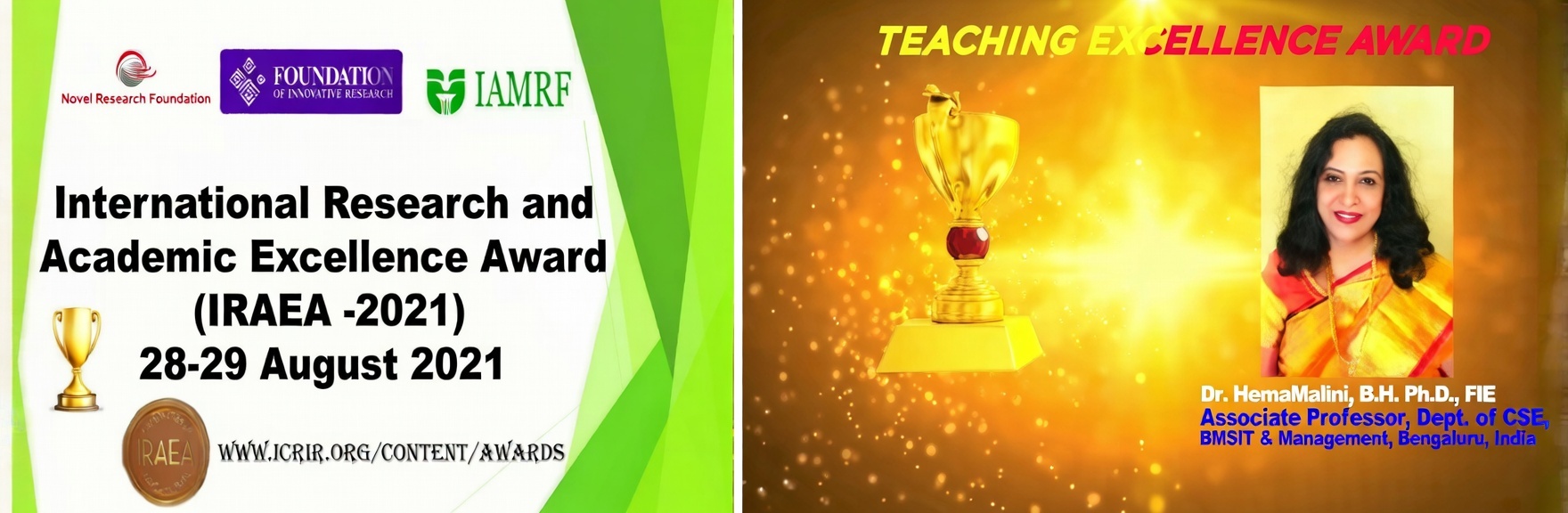 Dr. HemaMalini B.H. Associate Professor, Dept of CSE received the “Teaching Excellence Award” in International Research and Academic Excellence Awards Function (IRAEA - 2021) held on28.08.2021 to 29.09.2021 at Malaysia through Online Mode.