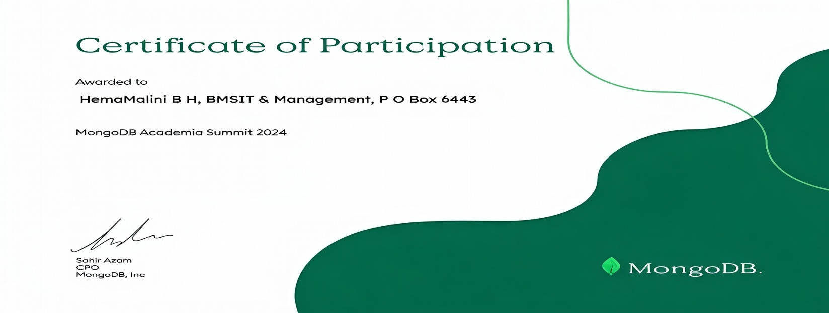 Dr. HemaMalini B H, Associate Professor, Dept of CSE attended MongoDB Academic Summit 2024, arranged at Sheraton Grand, Prestige Shantiniketan, Whitefield, Bangalore 0n 10-9-2024 in association with ICT Academy.