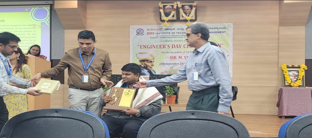 Dr. Gerard Deepak, Associate Professor, Department of Computer Science and Engineering was felicitated with the Best Researcher Award for 2023-2024 by BMS Institute of Technology and Management in the Engineers Day event on 15th and 20th September 2024.